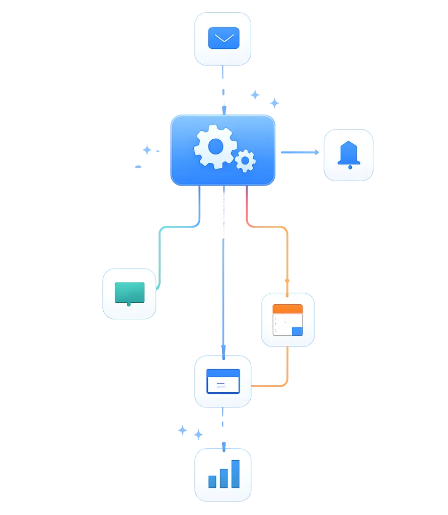 Det kan være alt fra automatisk opfølgning på leads til håndtering af bookinger, interne beskeder, dokumenter eller rapporter – uden manuel indgriben.